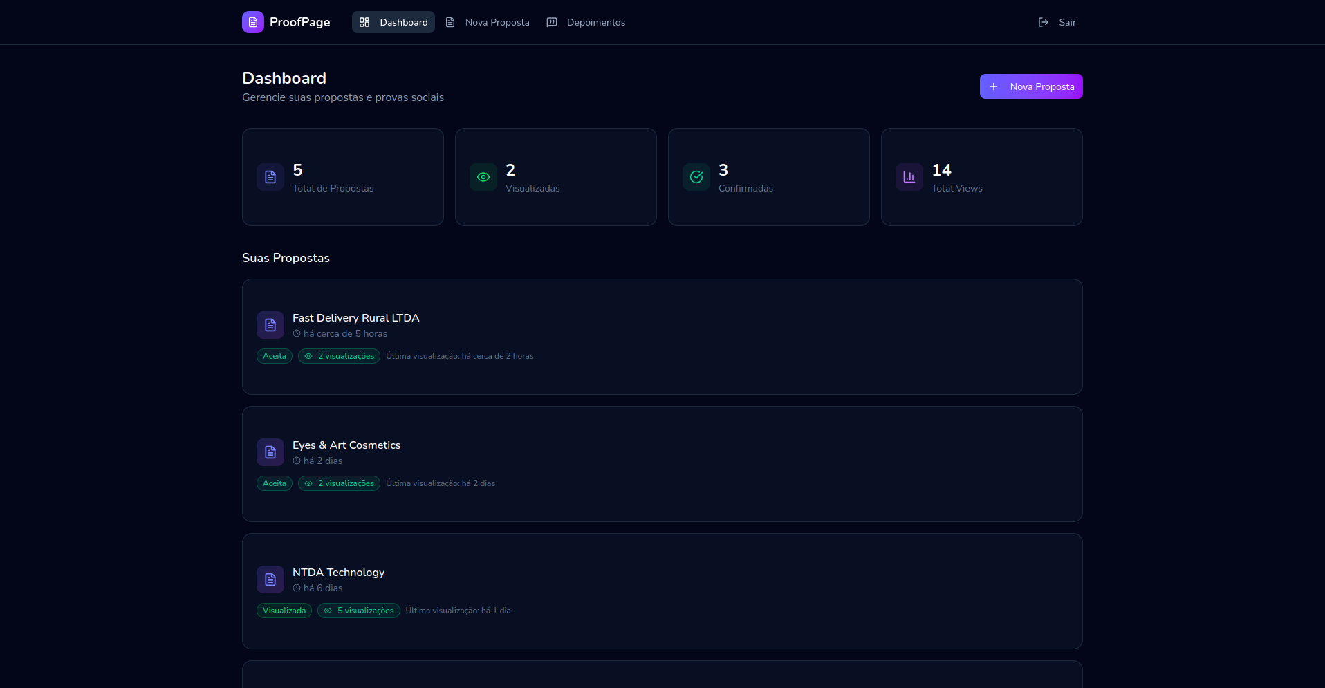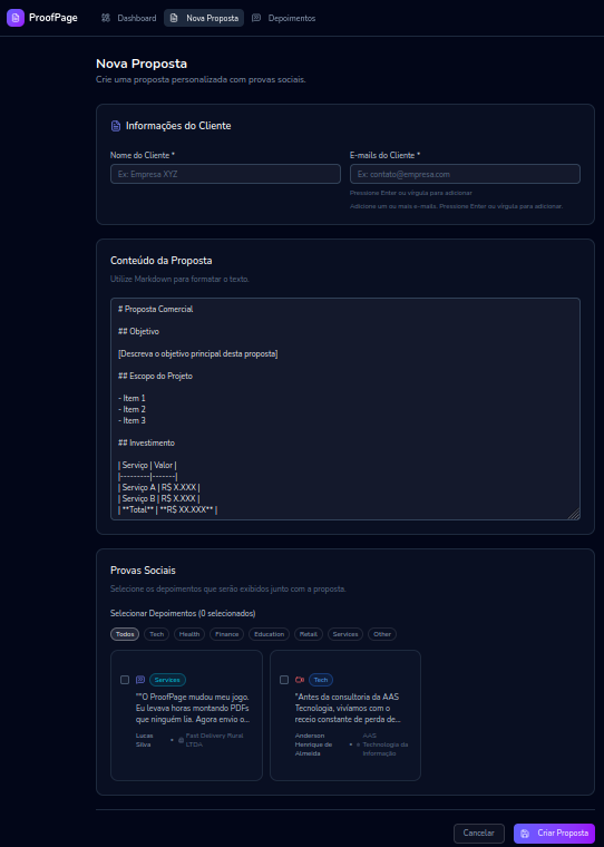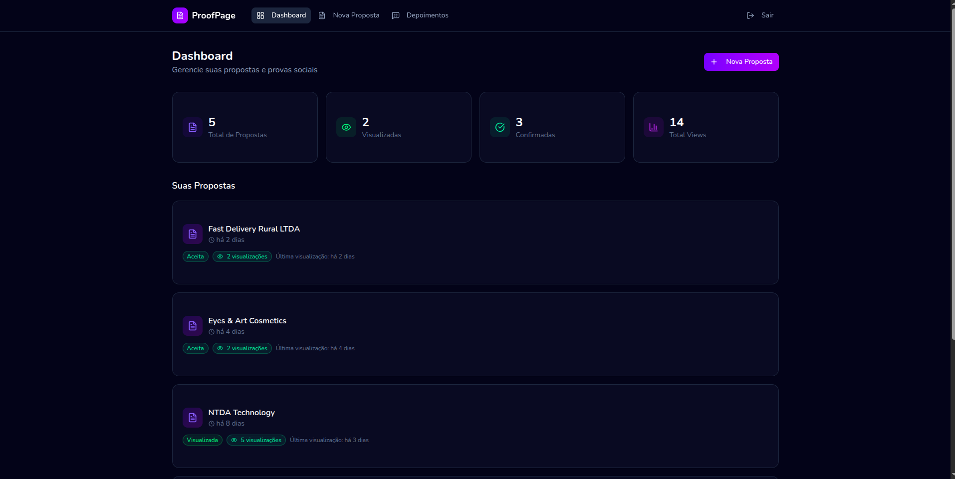 “A taxa de resposta das minhas propostas aumentou 40% desde que comecei a usar o ProofPage. Os depoimentos integrados fazem toda diferenca na hora de gerar confianca.”