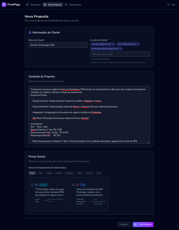 Integre depoimentos reais de clientes satisfeitos diretamente nas suas propostas.